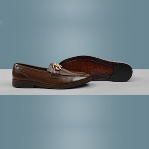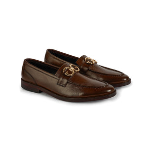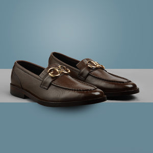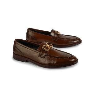 These Men's dressy shoes are made of brown leather, have delicate stitching details, a polished finish, and a sleek design. Gold-colored buckles adorn their tops, lending them a fashionable touch. With a traditional low heel and rounded front, these shoes blend comfort and style, making them ideal for formal settings.